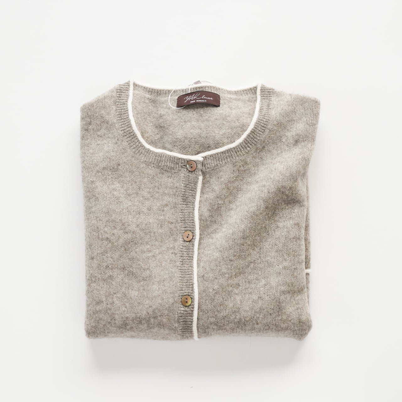 ヤク100%カーディガン(グレージュ×ホワイト(ラインカラーカシミヤ100%))